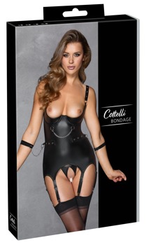 Aufregendes schwarzes Set von Cottelli BONDAGE mit Strapshemd, String ouvert und soften Handfesseln. Stilvoller Mattlook mit silberfarbenen Accessoires. Rundum elastisch und weich anschmiegsam für hohen Tragekomfort. Busenfreies Strapshemd mit leicht gepolsterten Bügel-Cups. Vorne 2 Fesselringe mit abnehmbarer Karabinerkette. Langer, verstellbarer Hakenverschluss im Rücken. Träger mit dekorativen Druckknöpfen verstellbar. Auch die 6 angenähten Strumpfhalter sind passend verstellbar. Seitlich in der Taille aufgesetzte Nieten-Riemen mit Ringen für die beiliegenden Handfesseln mit ihren Karabinerketten. Die soften Fesselriemen sind mit ihren Klettverschlüssen schnell angelegt und passend verstellbar. Der schrittoffene Mattlook-String komplettiert den fesselnden Look.