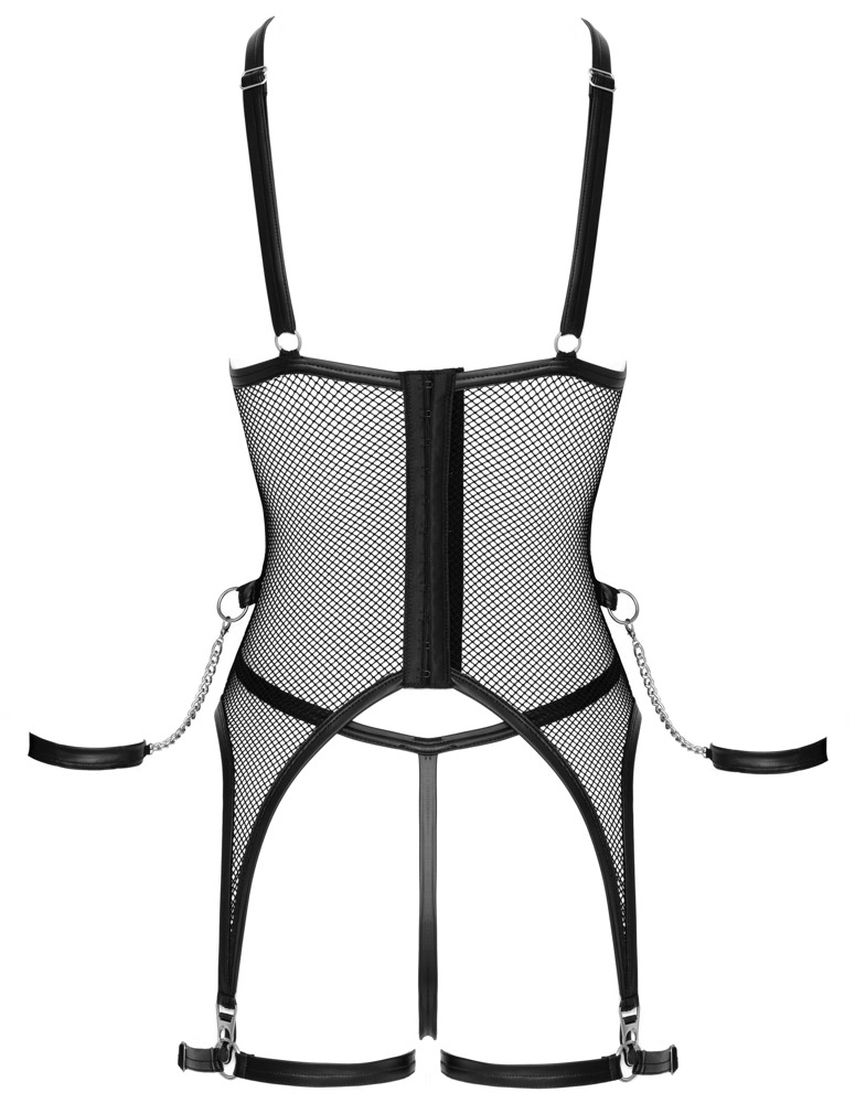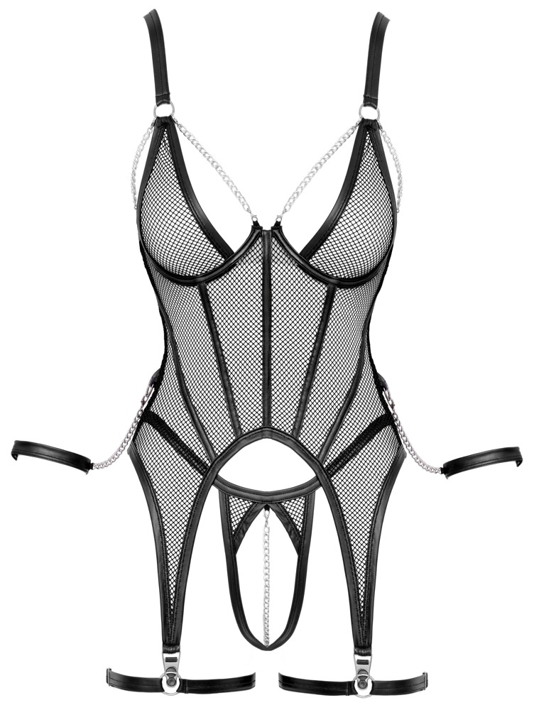 Sort net-sæt fra Cottelli BONDAGE med strømpeholderkjole, bundløs G-streng og bløde håndledsmanchetter. Det stilfulde matte look fremhæver de bløde, elastiske netmasker på en stilfuld måde – de påsatte striber foran sikrer en smuk silhuet. Sølvfarvede ringe, kæder og detaljer forfiner det spændende look yderligere. De dekorative kæder på bøjle-cupsene er aftagelige. For optimal pasform kan stropperne og den gennemgående hægtelukning i ryggen justeres. De elastiske lårremme på strømpeholderne kan også tilpasses individuelt. I taljen er der en ring i hver side til at hænge de medfølgende håndledsmanchetter med karabinhager på. De bløde håndledsmanchetter med velcrolukning er hurtige at tage på og kan justeres, så de passer. Den lille netstring fuldender det fængslende netlook. Den forfører og stimulerer med en aftagelig kæde i det åbne skridt.
