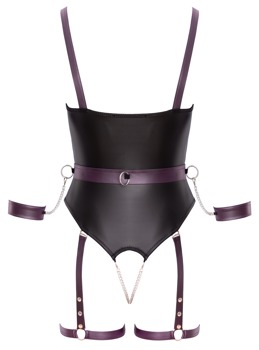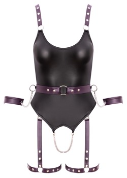 Skridtløs body med strømpebånd fra Cottelli BONDAGE inkl. bælte med bløde armmanchetter. Alt i et stilfuldt mat look – elastisk og blødt over det hele for høj komfort. Sort, spinkel body med dekorative detaljer i elegant mørklilla og sølvfarvet tilbehør. De brede stropper kan justeres med trykknapper. Ligesom strømpebånd og lårstropperne. Den spændende lårharness kan også tages helt af. 2 aftagelige intimkæder stimulerer det åbne skridt. Bæltet kan justeres med trykknapper og har ringe hele vejen rundt til at fastgøre karabinkæderne til armmanchetterne. De bløde ankelstropper i mat look kan hurtigt tages på og justeres med deres velcrolukninger, så de passer.