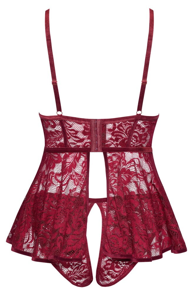Babydoll och öppen trosa i ett set från Cottelli CURVES av ädel mörkröd spets. Mjuk och elastisk för maximal komfort. Elastiska sammetsband och roséguldfärgade accessoirer. Tajt överdel med hjärtberlock mellan de mjuka kuporna. Baktill med justerbar hakknäppning. Även axelbanden kan justeras. Den utsvängda kjoledelen är slitsad baktill. Den passande spetstrosan förför med en öppen gren.