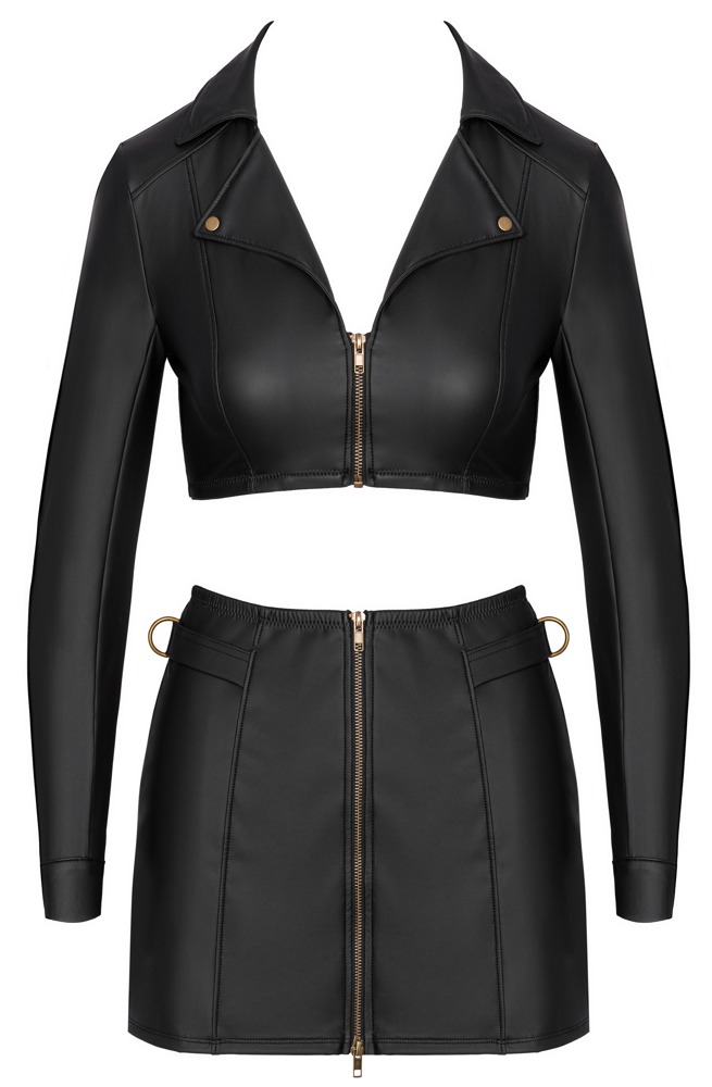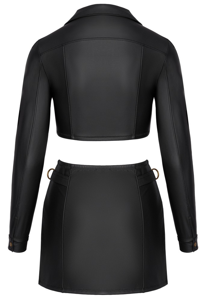 The clubwear set from Cottelli PARTY contains a short jacket top and a mini skirt. Everything is made out of black matte look material with brass-coloured details. Everything is soft and stretchy for a very comfortable fit. The jacket top is in a tight-fitting crop top style and also has a short full-length zip at the front. There are also decorative studs on the reverse collar and press studs on the cuffs. The narrow mini skirt stands out because of its full-length, 2-way zip at the front and its rings at either side of the waistband.