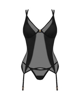 Suspender top and thong in the black Nesari set by Obsessive. Soft elasticated mesh in a stylish mix with opaque stretch material. Small jewellery element between the underwired cups. With an adjustable hook fastener at the low back. The sophisticated crossed double straps and suspender straps can also be adjusted to fit. The mesh thong is opaque at the crotch.