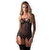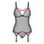 The 2-piece suspender set, Novenes from Obsessive, has a basque and thong. Everything is made out of delicate black powernet with pink strap accentuation. There are straps over the cleavage area and a beautiful rhinestone element between the wireless cups. The bra and suspender straps can be adjusted to fit. The basque also has a hook fastener at the back as well. The small thong adds the finishing touch to this elegant, transparent set.