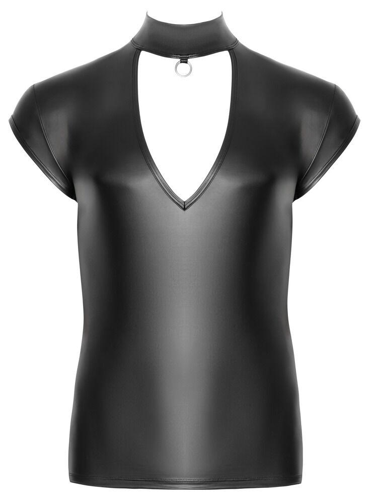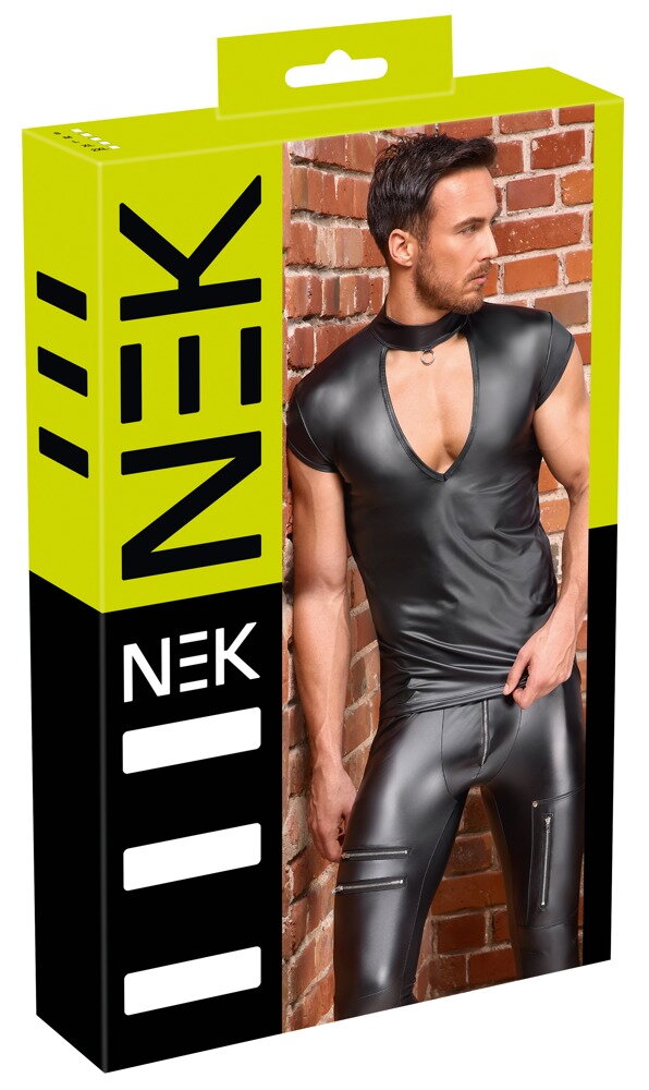 This emphasising, black shirt from NEK is made out of shimming matte look. It has short sleeves and an exciting V-shaped cut-out at the front underneath the striking stand-up collar. There is a ring and the front of the stand-up collar. It is soft and stretchy for a skin-tight but very comfortable fit.