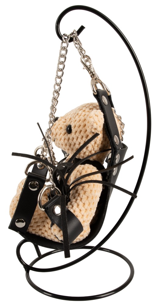 This small, tame SM Teddy with Swing from Bad Kitty is in a crocheted look and is very soft to the touch as well. It is in a typical SM look with a harness, restraints and mini flogger, which are all made out of black imitation leather. There is a keyring chain on its head. The small realistic seat is simply hooked into the mini sex swing's metal frame – then Teddy can take a seat…