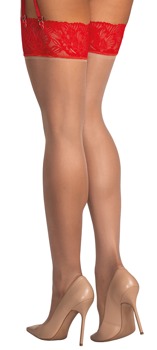 Pończochy do paska Matildea marki Obsessive w kolorze nude z szeroką elastyczną manszetą wykonaną z ozdobnej koronki w kolorze eleganckiej czerwieni. Miękkie i jedwabiście gładkie.