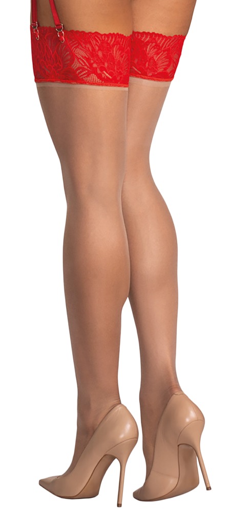 Nudefarvede Matildea-strømper fra Obsessive til fastgørelse på en hofteholder. Med brede elastiske kanter af dekorative blonder i elegant rød. Bløde og silkeagtige.