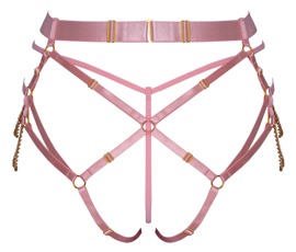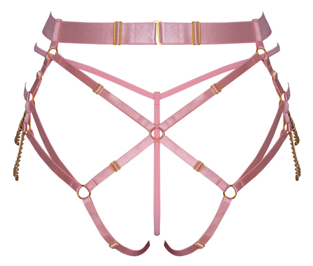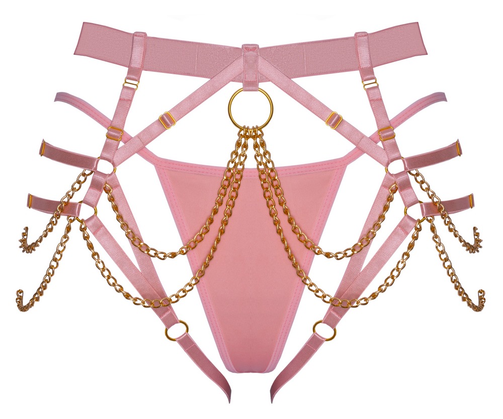 Extravagant harness string from Bad Kitty, including a mini G-string. Harness string made out of rose-coloured, elegantly shimmering stretchy straps with gold-coloured accessories. Swinging chains at the front and sides showcase the glamorous lingerie even more. The soft, elastic straps and wider waistband can be adjusted for a perfect fit. A rose-coloured mini G-string is included for a less revealing look.