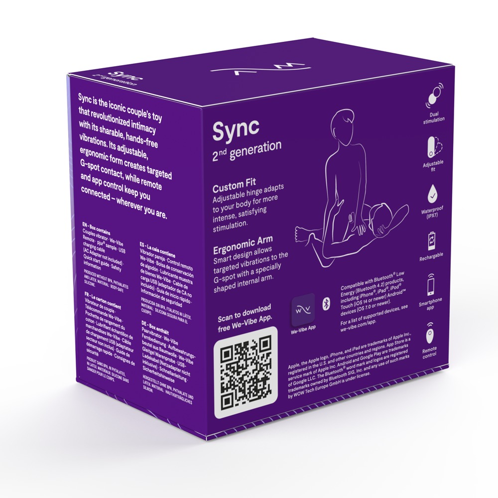Sterowanie jest wygodne i łatwe dzięki praktycznemu pilotowi. Oczywiście Sync2 jest kompatybilny z aplikacją We-Connect dla IOS i Android przez Bluetooth. Tutaj możesz samodzielnie tworzyć indywidualne programy stymulacji i wygodnie kontrolować wibracje za pomocą smartfona. Możliwe są również wibracje w rytm muzyki. We-Connect umożliwia również seksualną bliskość na odległość. Dodatkowe funkcje głosowe, czat i wideo są również zintegrowane z aplikacją. Zabawa jest możliwa wszędzie, ponieważ Sync2 jest wodoodporny.