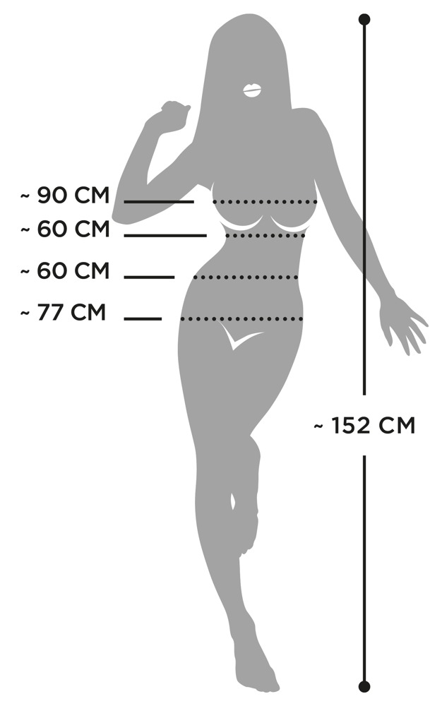 Dimensions (circonférence) : Poitrine 90 cm, taille 60 cm, hanches 77 cm.