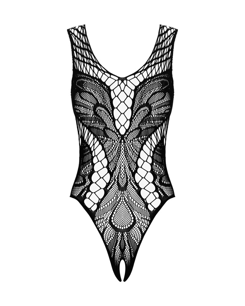 Czarne body bez krocza B138 marki Obsessive o różnych strukturach siateczki i wyjątkowym, tkanym wyglądzie. Miękki i elastyczny na całej powierzchni dla wysokiego komfortu noszenia. Skąpy krój z dużym wycięciem z tyłu. Uwodzicielsko otwarte w kroku.