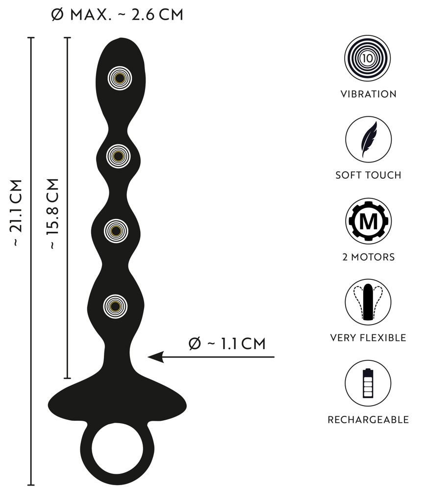 Intet er mere fristende at købe end at holde et produkt i hænderne og selv opleve dets fordele. Og denne fleksible, silkebløde premium-analkugle med 4 rillestrukturerede vibrerende kugler imponerer med sit udseende og sin fornemmelse samt sin brugervenlighed. Originale fleksible analkugler med hoppende vibrationer fra ANOS med 2 motorer til 10 kraftige vibrationstilstande plus en særlig tilstand til hoppende vibrationer.
