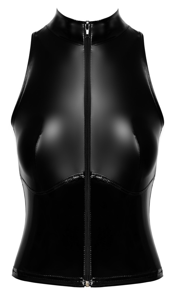 Ärmlös, tajt top från Noir i en svart, ädel mix av lack och powerwetlook. Mjuk och elastisk för maximal komfort och perfekt passform. Med liten ståkrage och genomgående dragkedja framtill.