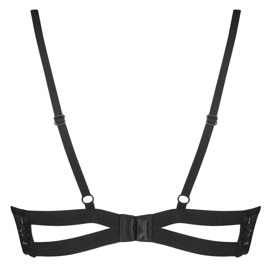 Sujetador negro con aros Nutris de Obsessive, confeccionado en suave encaje elástico. Con un pequeño elemento de bisutería entre las copas de encaje. El cierre de gancho en la espalda y los tirantes son ajustables.