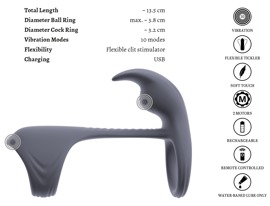 The VYLOR RC Cock & Ball Ring is made entirely out of silky soft silicone. The rings are easy to slip on. The wide, specially-shaped cock ring and bridge fit perfectly around the shaft and tip of the penis. The very flexible and stretchy clitoral stimulator adapts perfectly to every movement, so that the intense dual vibrations can always be felt. Maximum comfort for maximum fun!