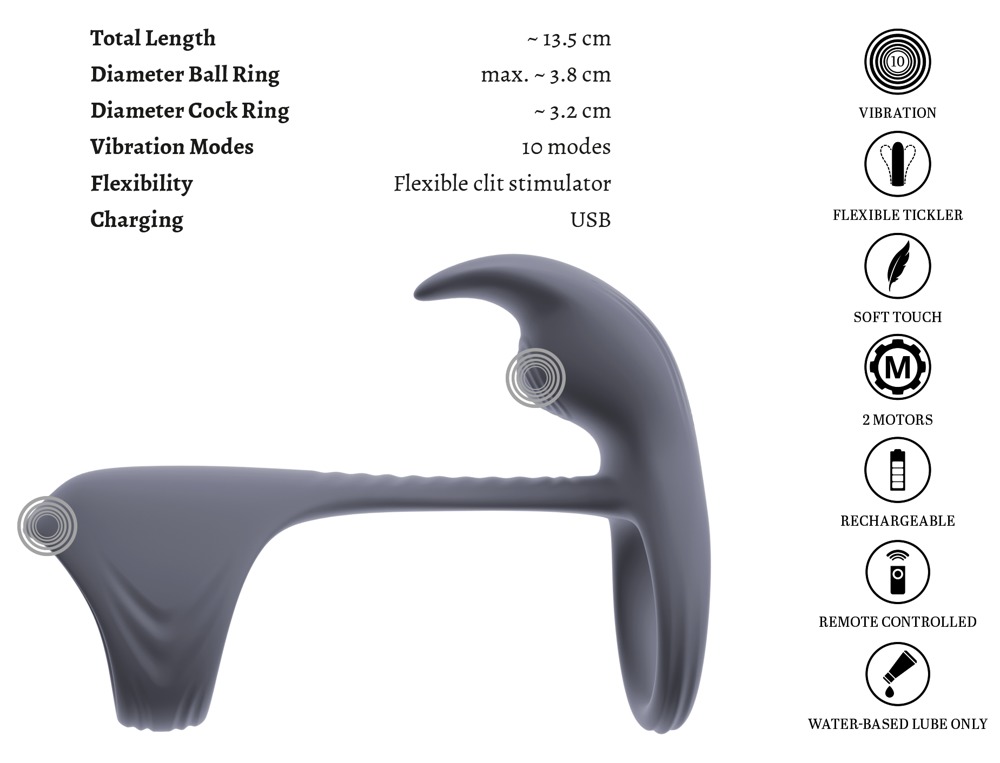 2 ciche silniki zapewniają po 10 trybów wibracji w stymulatorze łechtaczki i w szerokim przednim pierścieniu rękawa na penisa. Można nimi wygodnie sterować oddzielnie za naciśnięciem jednego przycisku za pomocą praktycznego pilota zdalnego sterowania. Dzięki zasięgowi 15 metrów mogą być również kontrolowane przez partnera. Wibracje można również łączyć i kontrolować bezpośrednio na zabawce w 10 trybach za naciśnięciem jednego przycisku.