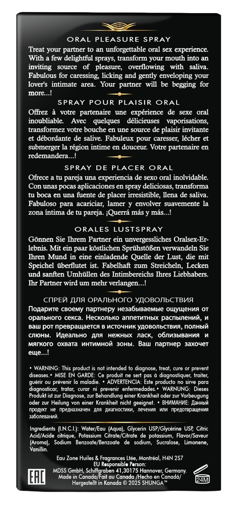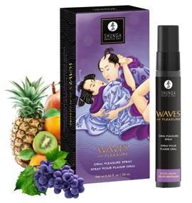 The Waves of Pleasure Exotic mouth spray from Shunga transforms the mouth and throat into a fruity source of pleasure for unforgettable oral sex. Exotic fruits are great for playful tongue action, deep kissing and intimate nibbling. Simply spray into the mouth/throat before oral sex.