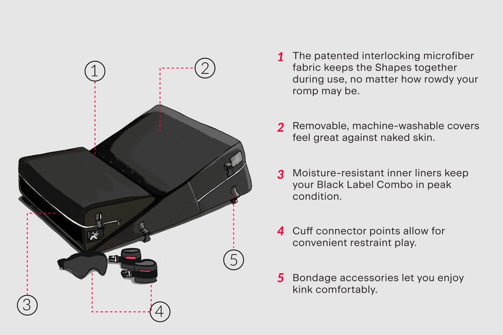 Två anatomiskt formade, svarta kärlekskuddar (wedge och ramp) med 4 bojor (2 x för armar/handleder och 2 x för fötter/anklar) och medföljande ögonmask. Inuti: polyuretanskum. Överdrag av mikrofiber som kan tvättas i maskin. Mått: ca B 61 x L 86 x H 30,5 cm.