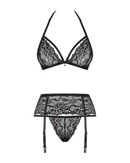 Reggiseno, reggicalze e perizoma nel set 838-SEG-1 di Obsessive. Tutti e tre i pezzi di lingerie sono realizzati in morbido pizzo nero elasticizzato. Reggiseno con spalline e dettaglio gioiello tra le coppe morbide. Il collo alto e il reggicalze sono regolabili per una vestibilità perfetta.
