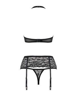 Sujetador, liguero y tanga en el conjunto 838-SEG-1 de Obsessive. Las tres piezas de lencería están confeccionadas en suave encaje negro elástico. Sujetador con tirantes y detalle de joya entre las suaves copas. El escote halterneck y los tirantes son ajustables para un ajuste perfecto.