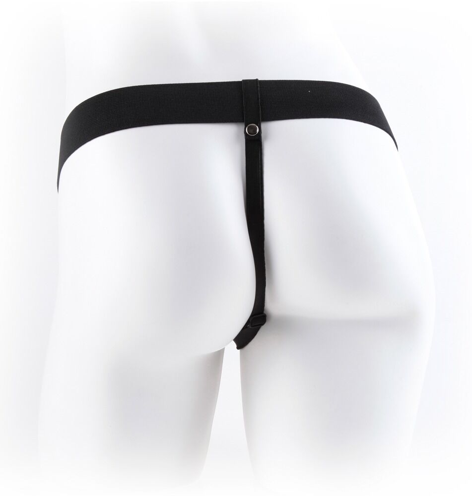 Hul penisdildo med elastisk strap-on belte. Dildoen kan tres over penis pg gir øket lengde og omfang eller den kan brukes av henne til pegging. Strap-on beltet er justerbart og elastisk.
