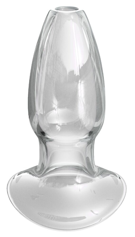 Hul analplugg med stopper som hindrer for dyp inntrengning. Perfekt til klysterbehandling og lek med minivibrator. Eksklusiv, gjennomsiktig design i borosilikatglass. Kan fylles med opptil ca. 0,6 dl.