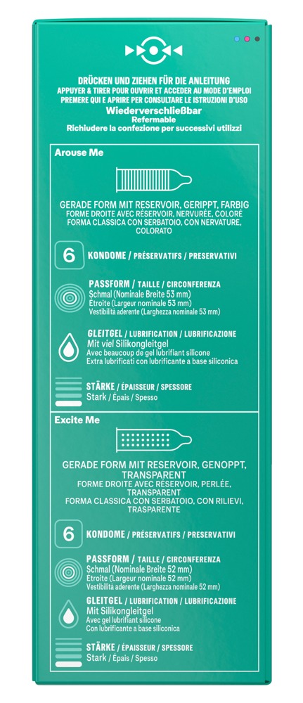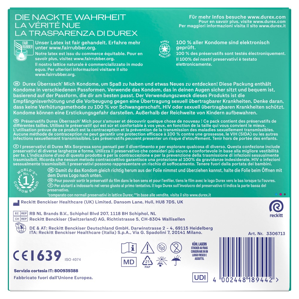 This economy pack Überrasch' Mich (Surprise Mix) has 30 Durex condoms that are in their well-known high quality. There are 4 different and exciting types of condoms: