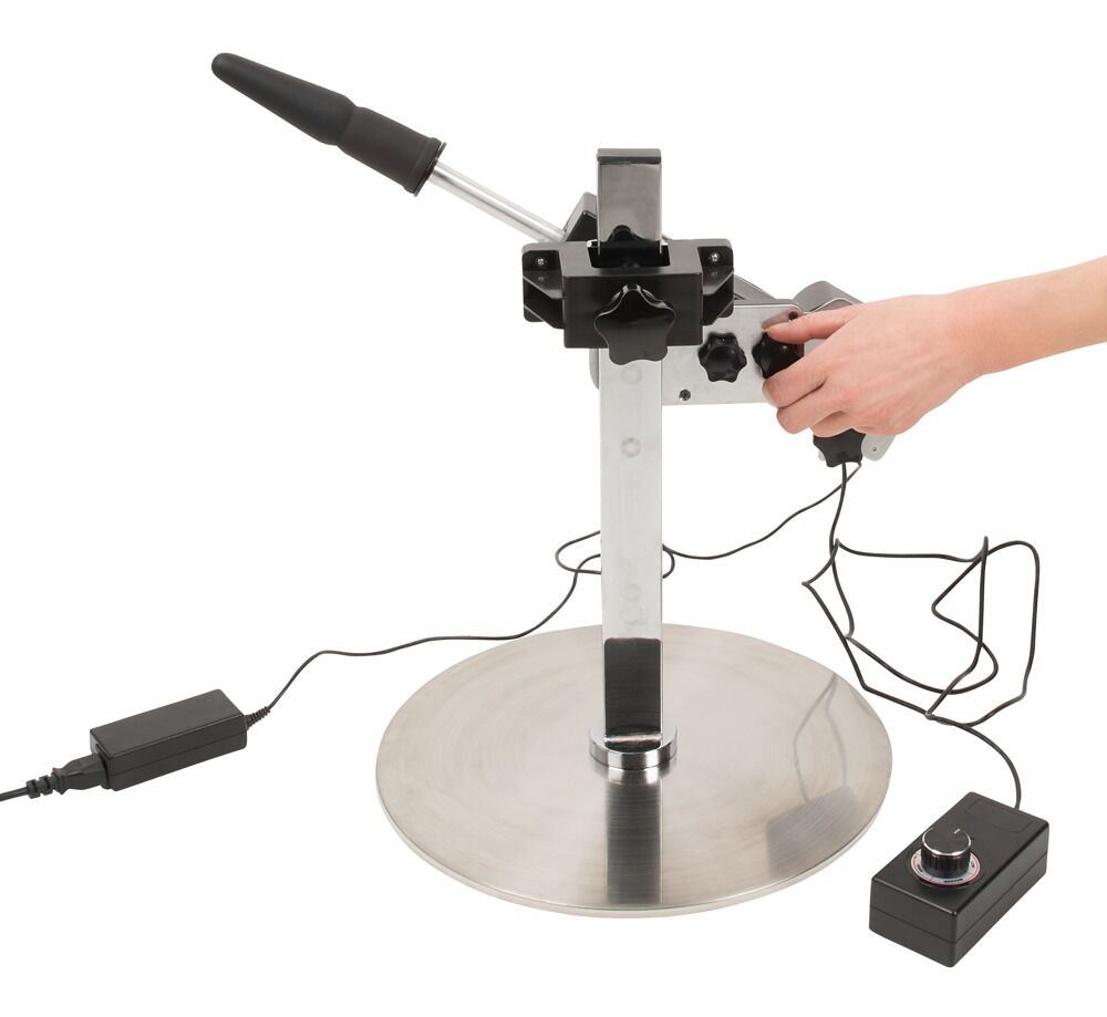 Sexmaskin med justerbart stativ med to påsatser. Justeres med fjernkontroll og kan dreies nesten 360°. Trinnløs støtjustering med opp til 150 støt i minuttet. Handsfree bruk i moderne, slank form for maksimal brukervennlighet.