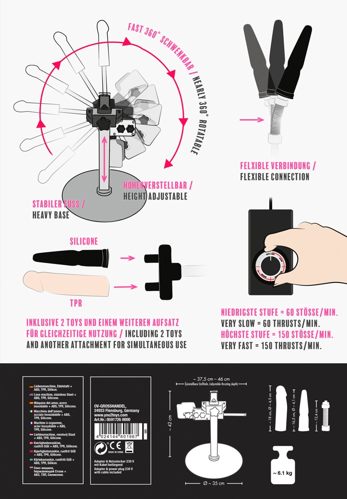 Sexmaskin med stativ som kan justeras i höjd samt två påsatser. Med fjärrkontroll. Kan vridas till nästan 360 grader. Den steglösa stötreguleringen klarar upp till 150 stötar per minut och stötdjupet kan ställas in på upp till 8 cm. För en frihändig betjäning i kombination med en smal, modern design för maximal användning. Kabeln är 1,5 m lång med kontakt typ F. Påsats för dubbel penetration medföljer.