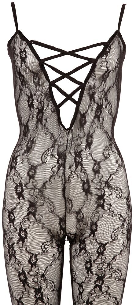 Catsuit aus weicher Effekt-Spitze mit tiefem Stretchband-Dekolleté in Schnüroptik. Im Schritt erregend offen! Mit Fuß.