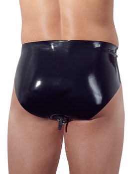 Svart latexkalsong med uppumpbar plugg (ca. 12 cm lång, Ø ouppumpad 5 cm). Med utbuktning för penis och pung. Bollpump med tryckreglage. Tillverkad av naturkautschuklatex som kan vara allergiframkallande.