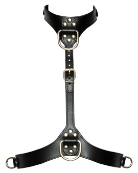 Bröstharness från Bad Kitty i snygg, svart läderlook med silverfärgade metalldetaljer. Kan justeras för storlek S-L med spännen. Halsbojan och bältet under bysten har stabila, nitade D-ringar framtill för andra accessoirer.