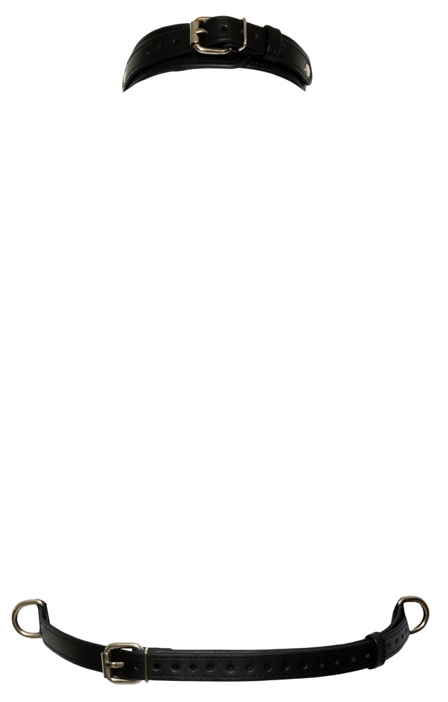 Brystharness fra Bad Kitty i stilig svart jukselær med detaljer i metall. Solid kvalitet og justerbar med spenner fra S-L. Halslenke og brystsele med dekorativ solid D-ring foran hvor lenketilbehør kan festes.