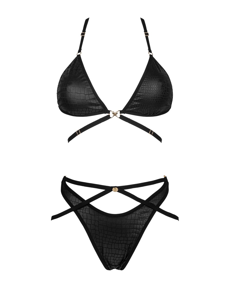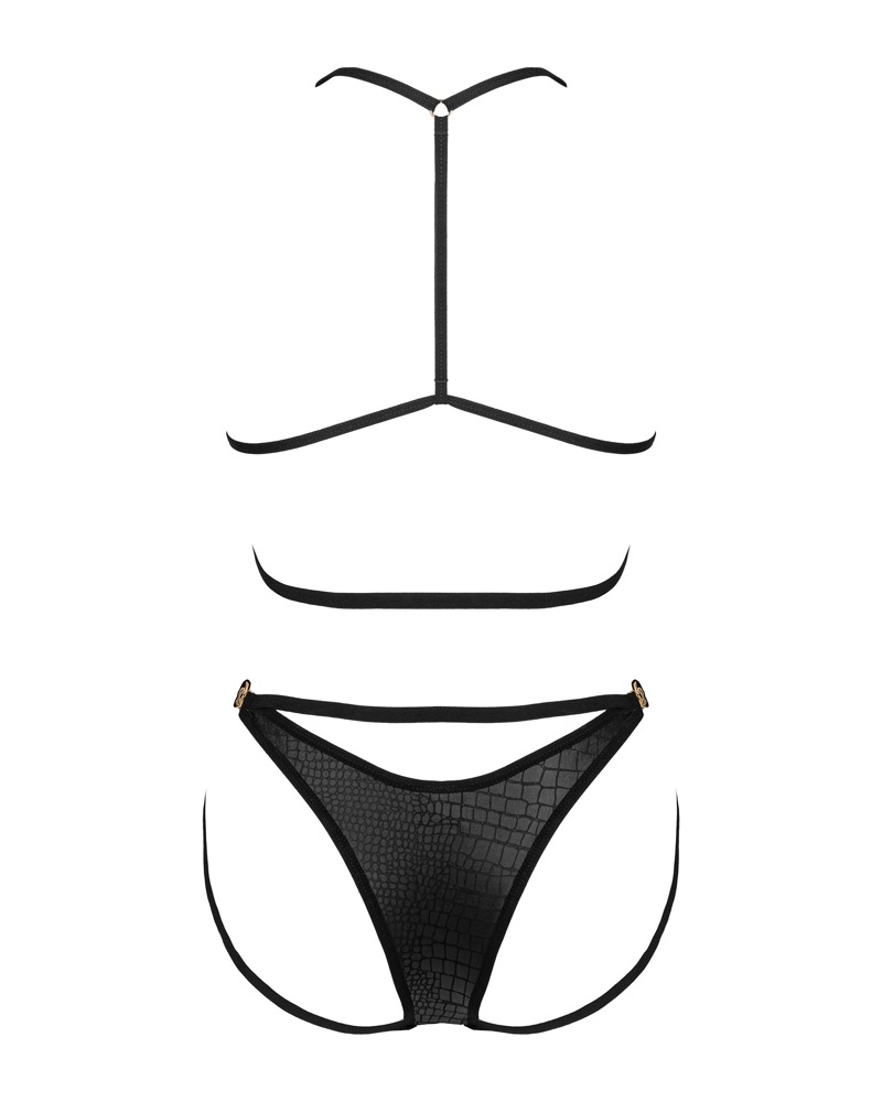 Set Cobra Nive von Obsessive mit Soft-BH und Slip in schwarzer Schlangenhaut-Optik mit elastischen Riemchen und goldfarbenen Details. Rundum weich und elastisch für hohen Tragekomfort. BH mit Vorderverschluss, die Träger und Unterbrust-Riemchen sind passend verstellbar. Der Slip im Riemchen-Look verführt mit einem Verschluss jeweils seitlich.