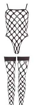 Corpo di Rio e calze in un set. Il tutto realizzato in rete nera, elastica, morbida e grossolana, senza cuciture. Calze di sostegno con rinforzo in silicone antiscivolo nella parte superiore. 90% poliammide, 10% elastan.