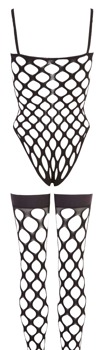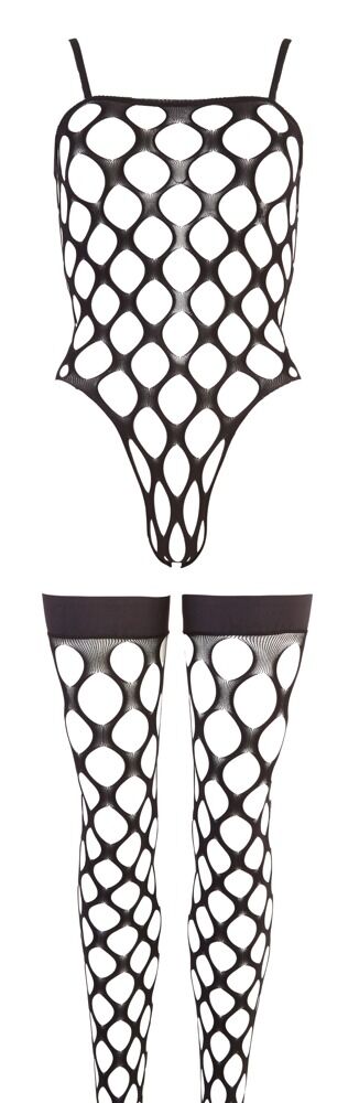 Rio-Body und Strümpfe im Set. Alles aus schwarzem, elastischem, weichem Grobnetz, nahtlos gefertigt. Halterlose Strümpfe mit rutschfester Silikonverstärkung im Abschluss. 90% Polyamid, 10% Elasthan.