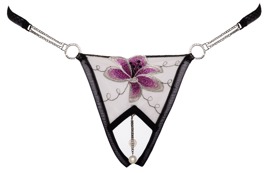 The crotchless string from Cottelli LINGERIE is made out of delicate tulle net and it has a beautiful flower and delicate embroidery at the front of the seductively open crotch area. There are 2 small, swaying chains with pearls decorating and stimulating the crotch areas – they are also removable. The stretchy waistband has rhinestone chains and rings at the front (at either side). There is a stretchy powernet insert at the back for a perfect fit.
