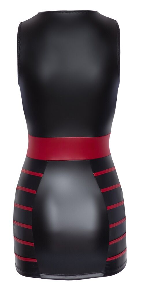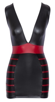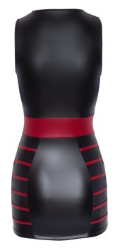 Short, tight-fitting dress from Cottelli PARTY made out of black matte look material. There is a red stripe around the waist and red stripes at either side of the skirt part which emphasises sexy curves. It has a very low-cut neckline. Soft and stretchy for a comfortable fit.