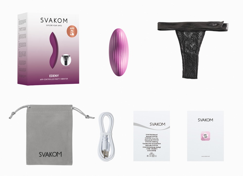 Rechargeable, lay-on vibrator that can be placed inside the included lace briefs for quiet and discreet pleasure. The vibrator won't slide around in the briefs. The small, easy-to-use, lay-on vibrator is in a wonderful, ergonomic shape that adapts perfectly to a body's contours. The vibrator is soft and flexible. It also has stimulating grooves as well. The 11 whisper quiet vibration modes can be easily controlled via the app or Bluetooth – anywhere in the world, whenever and by anyone. Includes a USB cable and storage bag.
