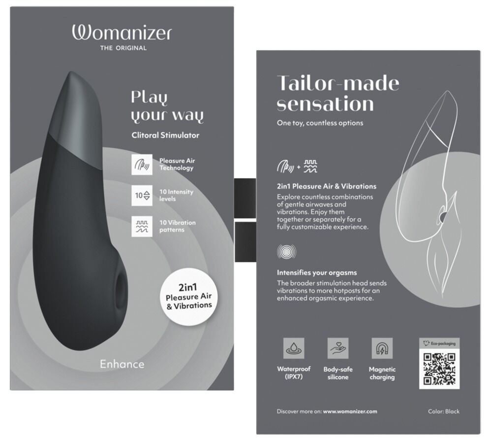 Den ergonomiske og handy ENHANCE fra Womanizer glæder sig over den nye unikke kombination af Pleasure-Air-teknologi og ultrakraftige We-Vibe-vibrationer. Pulserende trykbølger forkæler klitoris uden at røre den, mens de dybe, kraftige vibrationer spreder sig over hele vulva. Klimakset kommer hurtigt og pålideligt – orgasmer for alle!