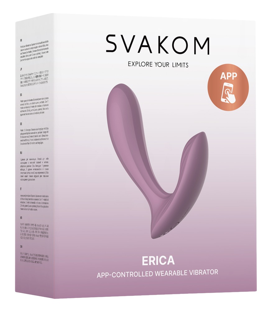 Ladbar og vanntett trusevibrator Erica fra SVAKOM. Ergonomisk formet for samtidig stimulering av vagina/G-punkt og vulva/klitoris. Diskret og stillegående - det er ingen som merker lysthemmeligheten din! Den smidige og mykt strukturerte silikonvibratoren tilpasser seg fleksiblet kroppen og bevegelsene. Nytelse på toppnivå.