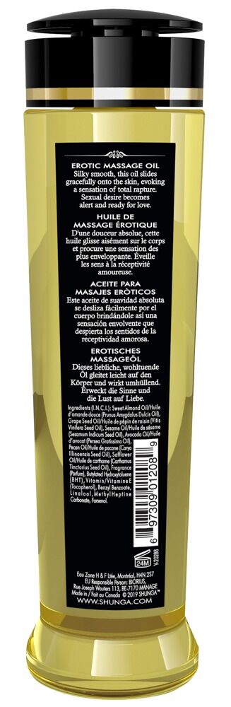 Luksuriøs erotisk massageolie Romance fra Shunga med sensuel jordbær/champang-duft, der vækker sanserne under en solo- eller partnermassage og får dig til at ønske mere! Den veganske massageolie er fremstillet af 100 % koldpressede naturlige olier og indeholder hudplejende E-vitamin. Den glider blidt og let hen over huden. Den glider blidt og let hen over huden uden at efterlade en ubehagelig fedtet fornemmelse og rester. Tværtimod, den efterlader huden silkeblød! Desuden er den meget produktiv til mange sensuelle og lidenskabelige helkropsmassager.