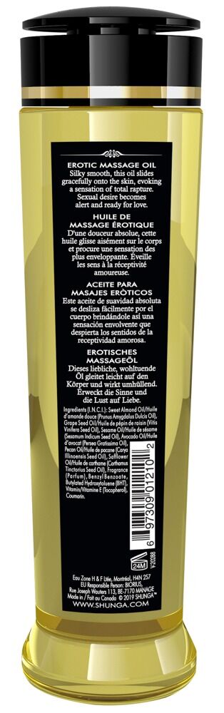Lujoso aceite de masaje erótico Adorable de Shunga con un sensual aroma a coco que despierta los sentidos durante un masaje en solitario o en pareja y hace que quieras más El aceite de masaje vegano está elaborado con aceites naturales 100% prensados en frío y contiene vitamina E que cuida la piel. Se desliza suave y fácilmente sobre la piel. Se desliza suave y fácilmente sobre la piel sin dejar una sensación desagradable de grasa y residuos. Por el contrario, ¡deja la piel suave como la seda! Además, es muy productivo para muchos masajes sensuales y apasionados de cuerpo entero.