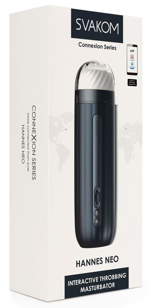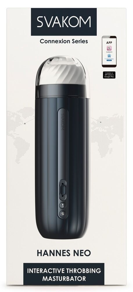Helautomatisk pulserende masturbator Hannes Neo fra SVAKOM med uttagbart pirrestrukturert sleeve til intensiv penismassasje. Med dyptgripende banke-pulserende støtfunksjon i 5 intensiteter og varmefunksjon som skaper en svært naturtro følelse. Alt justeres enkelt per tastetrykk/skyver (trinnløs hastighet) rett på masturbatoren eller per FeelConnect app og smarttelefon med 3 hovedfunksjoner: Long Distance Control (til enhver tid, fra hele verden), forbindelse til 2D-videoer og interaktiv webcam-funksjon.