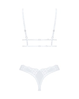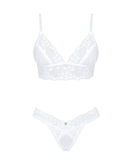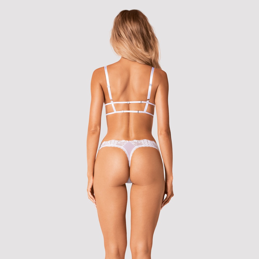 Niebiański komplet marki Obsessive z miękkim biustonoszem i stringami. Wykonany z białej, delikatnej siateczki w uwodzicielskim wzorze ton w ton z piękną kwiatową koronką. Miękki i elastyczny na całej powierzchni dla wysokiego poziomu komfortu. Miękki biustonosz o dłuższym kroju z dwoma zapięciami na haftki z tyłu, które są tak samo regulowane jak ramiączka.
