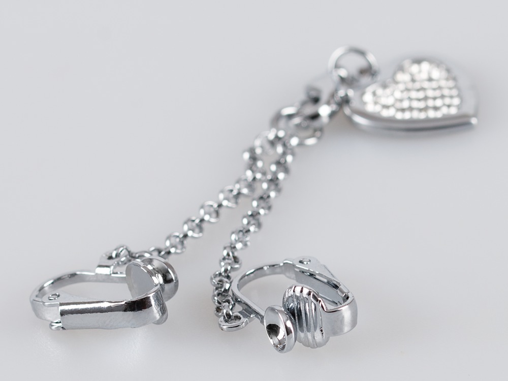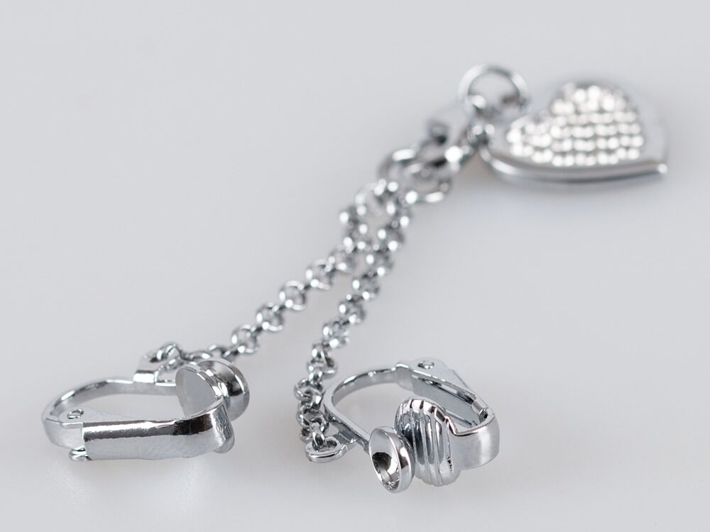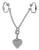 Zilverkleurige intieme ketting met strass hartjeshanger en schaamlippenklemmen.