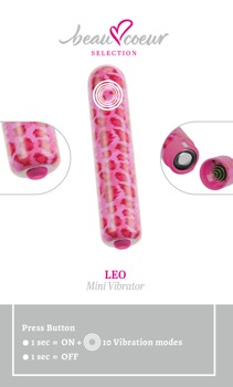 Verspielter Mini Vibrator LEO von beau cœur im poppigen Pink-Leo-Design. Stylisch, unauffällig und sehr diskret in jeder Tasche und auf dem Nachttisch. Somit immer schnell einsatzbereit fürs intime Spiel. Ideal für spontane Abenteuer – allein oder zu zweit! Das kleine freche Kraftpaket überrascht dabei gleich mit 10 vielseitigen, intensiven Vibrationsmodi. Einfach und bequem per Knopfdruck.