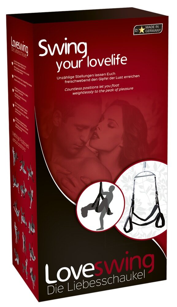 Genießen Sie die Liebe immer wieder neu - die unzähligen Stellungsvarianten, die mit der Liebesschaukel möglich sind, werden Sie begeistern! Liebesschaukel mit breiten, leicht verstellbaren Gurten. Komplett mit Spezialfeder. Belastbar bis 150 kg. Inklusive Gebrauchsanleitung sowie Stellungsvorschläge. Gurte: 100% Polyester, Polster: 100% Polypropylen, Schaumstoff: PE-Schaum, Stangenüberzug: 100% Baumwolle. Schieber: Metall, glanzvernickelt, Hakenband: 100% Polyamid, Halbring: Eisen, Karabiner: Metall, verzinkt, Kette und Zugfeder: Metall, galvanisch verzinkt. Unterlegscheibe: Stahl verzinkt, Mutter: Vollmetall.