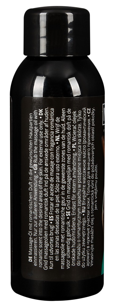Pleiende erotisk massasjeolje med sanselig romantisk duft. Vannbasert. Langvarige glideegenskaper. Made in Germany. 50 ml flaske.