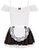 Overdelen er i hvidt blonde og de tynde stropper kan justeret. Toppen kan også bruges skulderfrit. Det sorte skørt er let buet og har en hvid blondekant i bunden… Et lille hvidt forklæde til at binde med blonder i kanten afrunder outfittet.